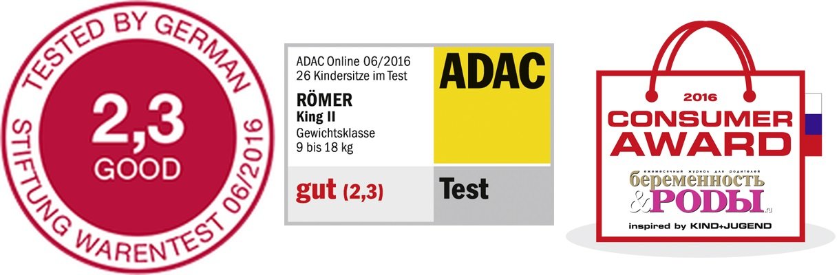 Romer King II имеет расширенную систему боковой защиты, боковые стенки заполнены энергопоглощающим материалом плюс дополнительные накладки на корпусе. Подголовник достаточно массивный и хорошо защищает голову ребенка. Несмотря на отсутствие Isofix, кресло крепление штатным ремнем не уступает ему в надежности, поэтому кресло King II получило хорошие оценки в краш-тестах.